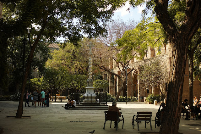 The next day you see a man the siting next to the pigeon, we were chatting away for half an hour, my Spanish was a little better by this stage, still struggling but between my bad Spanish, and his slightly better English, I was finding out a little about his life story and how he ended up coming from Morocco and settling in Barcelona. You don't get too much of that in the tube in London. Everyone is always on their phone in their own little world, not even wanting to interact with much in the way of eye contact. In this little oasis in the city of Barcelona though, noone brought their phones out. they were either just chilling in silence happy to be away from the buzz of the city, having something to eat or drink in a small restaurant to the right just out of viewpoint from this photo above. Playing chess with giant pieces on the slabwork, or chatting to old and new friends.